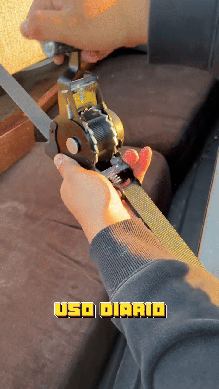 Extiende la correa, ajusta con el trinquete y listo. Al terminar, se retrae automáticamente, manteniéndose siempre organizada y lista para el próximo uso.